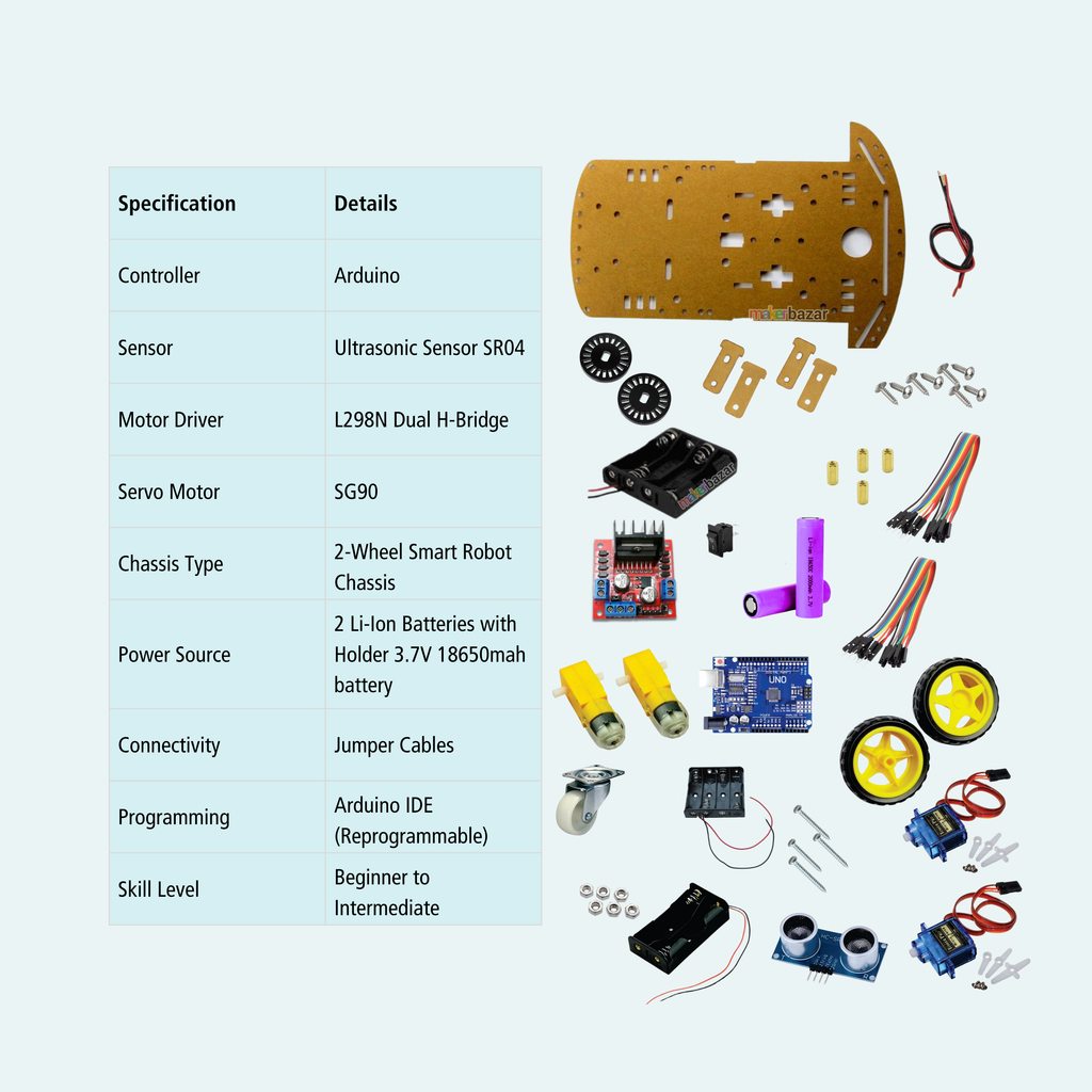 Powered by a pre-programmed Arduino board, this kit allows users to quickly assemble and run the robot while also offering the flexibility to modify code and expand functionality. With a sturdy 2-wheel chassis, motor driver, servo motor, and rechargeable power setup, this kit is ideal for learning the fundamentals of robotics, electronics, and embedded programming.