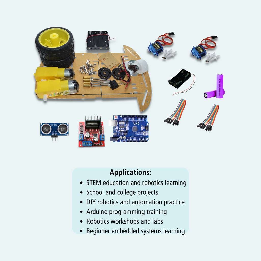 The Arduino Obstacle Avoiding Robot Kit is a hands-on educational robotics project designed for beginners, students, and hobbyists. This smart robot uses an ultrasonic sensor to detect obstacles and automatically changes direction to avoid collisions, demonstrating real-world automation and sensor-based decision making.