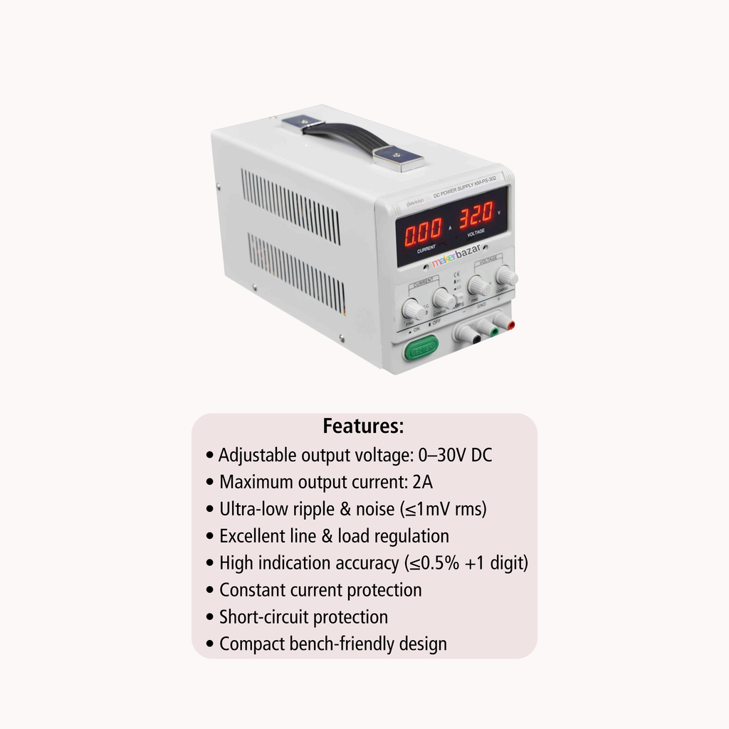 The HTC DC-3002 Linear Regulated DC Power Supply is a compact, high-precision bench power supply designed for laboratories, workshops, educational institutes, and electronics enthusiasts. Delivering adjustable output from 0–30V DC with up to 2A current, it provides clean, stable, and low-noise power for testing, prototyping, and repair applications.