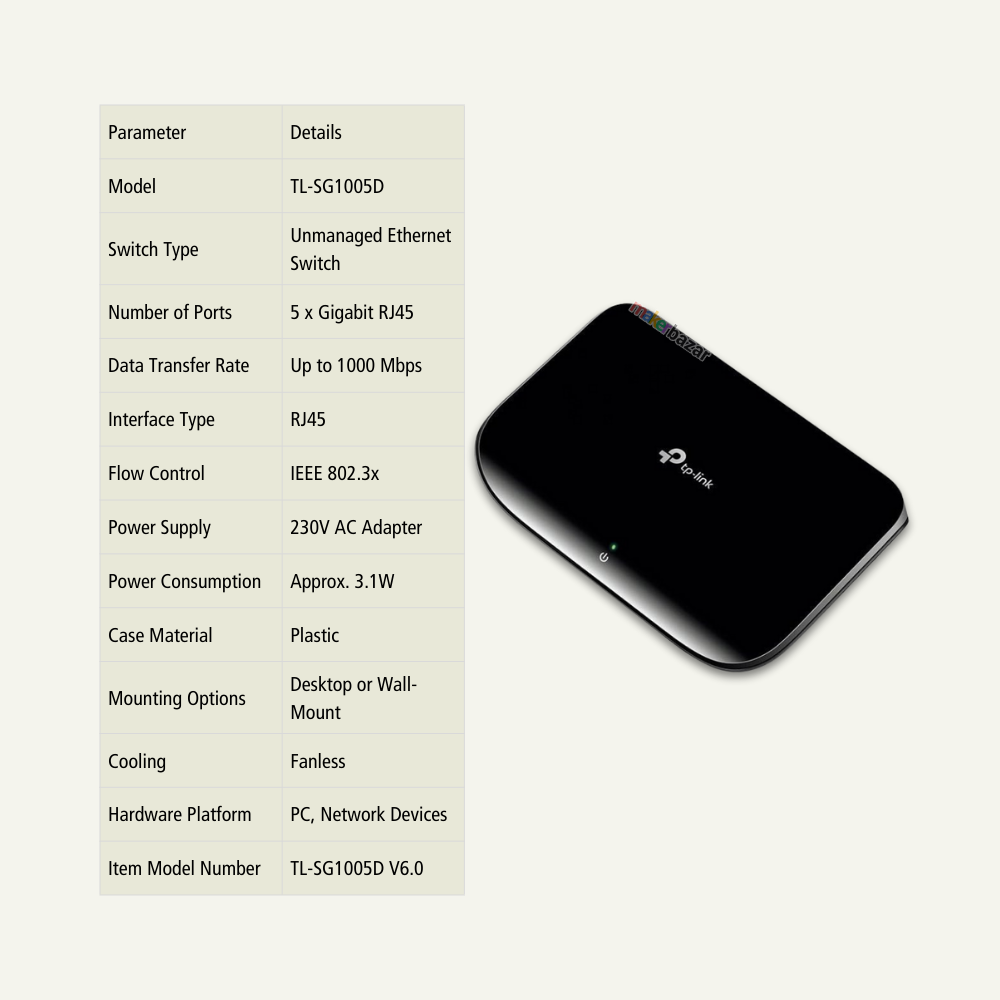The TP-Link TL-SG1005D 5 Port Gigabit Ethernet Switch is a reliable, high-speed networking solution designed for homes, offices, and small businesses. Featuring 5 Gigabit auto-negotiation RJ45 ports, this unmanaged switch allows you to instantly expand your wired network with stable and ultra-fast data transfer speeds up to 1000 Mbps.